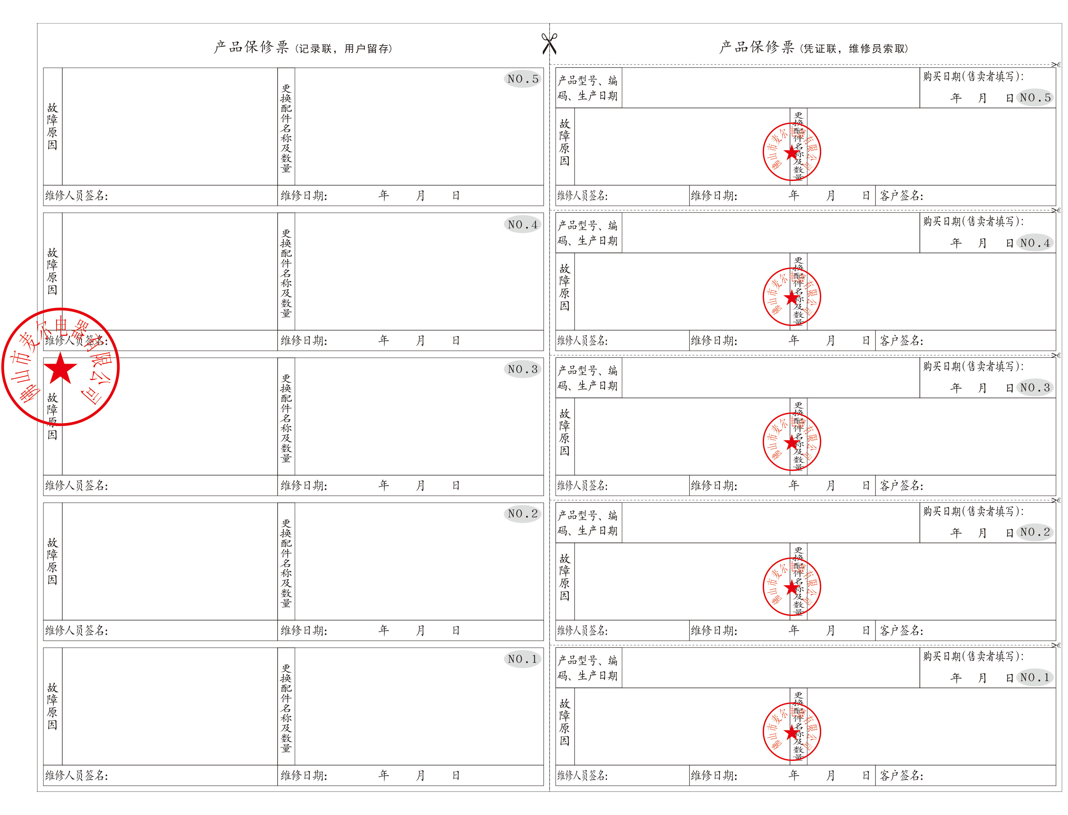 5、保修票備有5份,在保修期內保修票用完的情況下,用戶可將保修卡、保修票(記錄聯(lián))